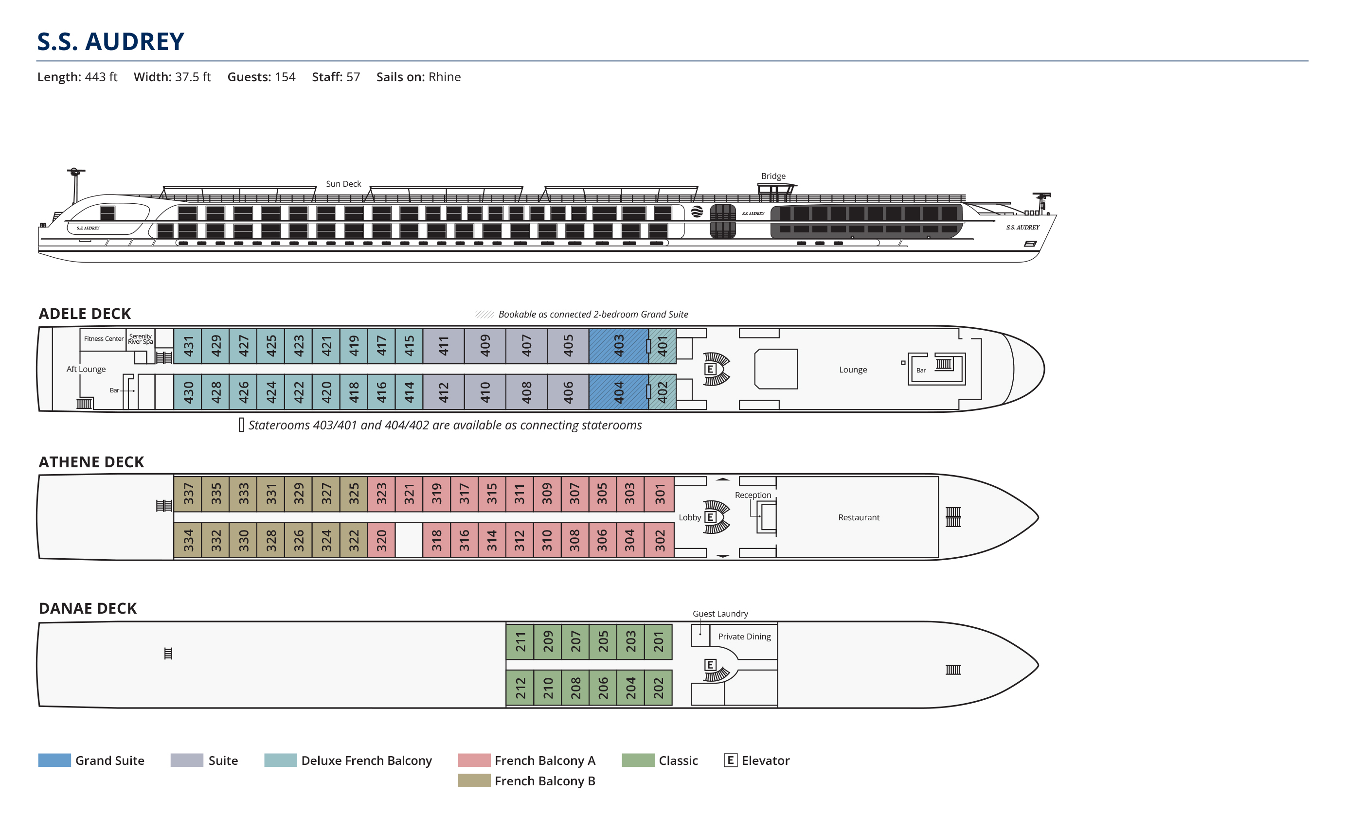 1960年代に世界的に愛された映画スター オードリー・ヘプバーンに因んで命名された 「S.S.オードリー号」でライン川とそのオランダ支流を航行するのはいかがでしょうか?船内には、ヘプバーンの人生や作品から着想を得た美しい空間が広がり、彼女の象徴的なスタイルが随所に散りばめられます。